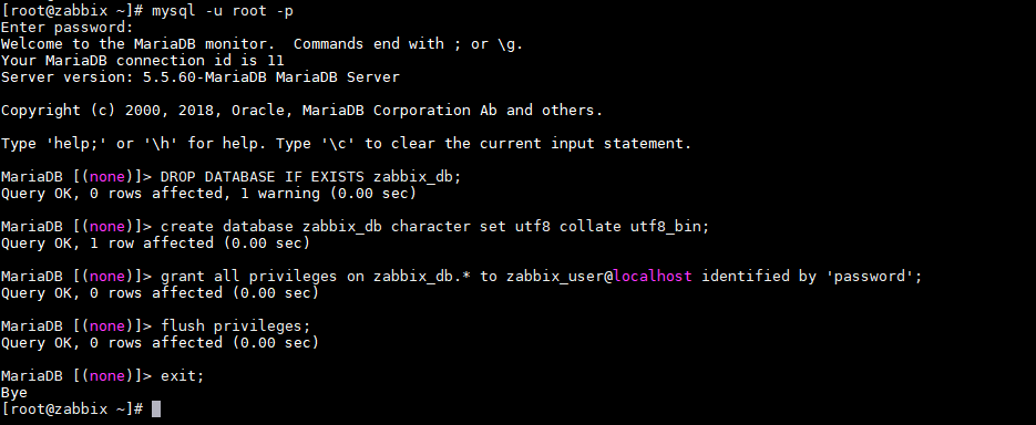 MariaDB [(none)]> create database zabbix_db character set utf8 collate utf8_bin;